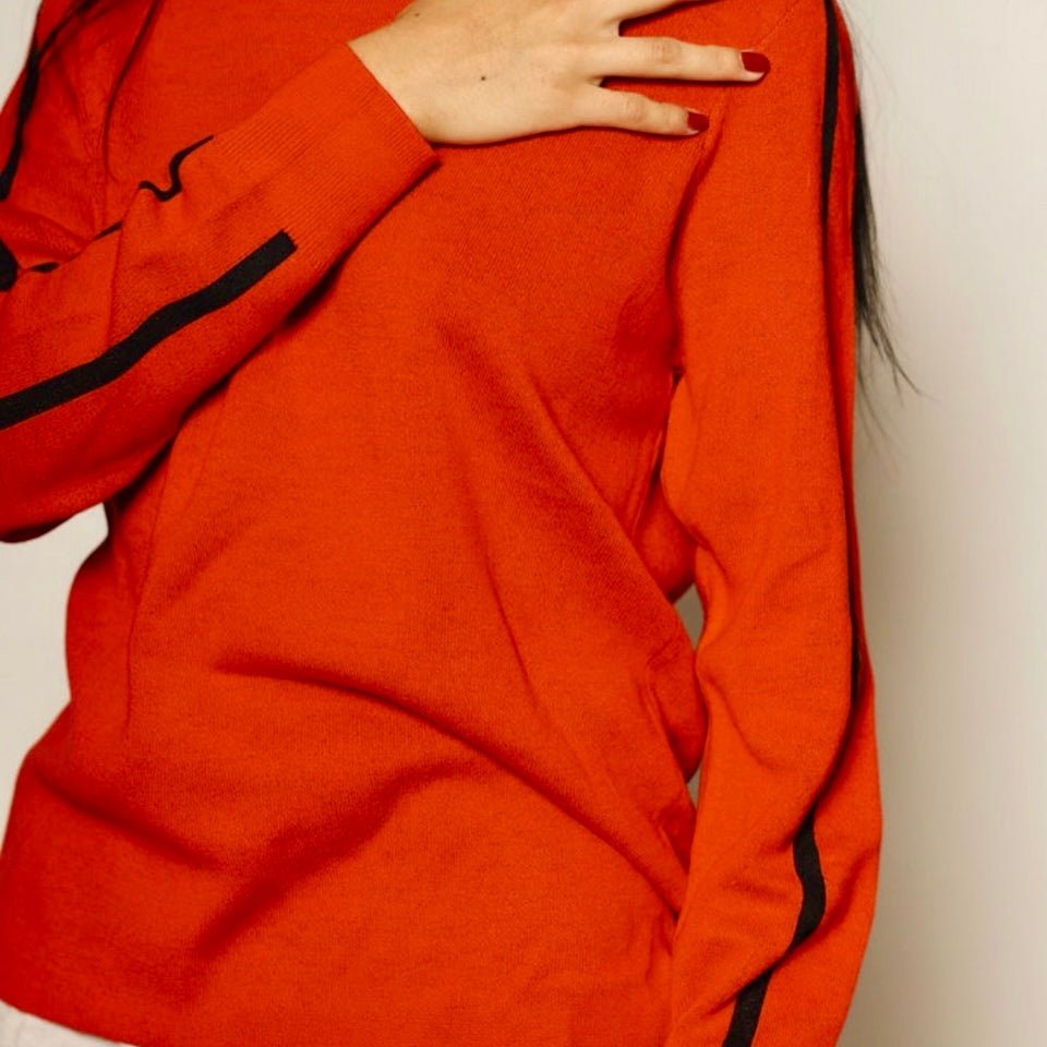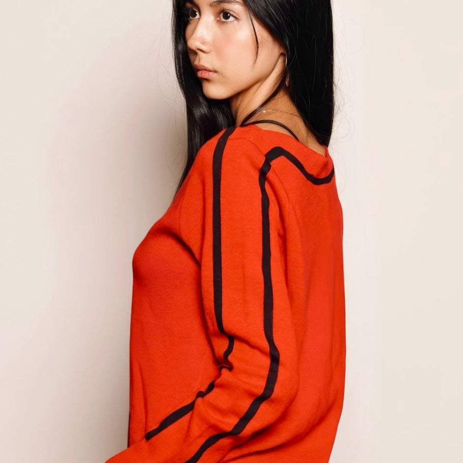 A vibrant red knit sweater with sleek black stripe details along the sleeves. Relaxed fit and soft fabric make it a standout piece for casual chic looks.