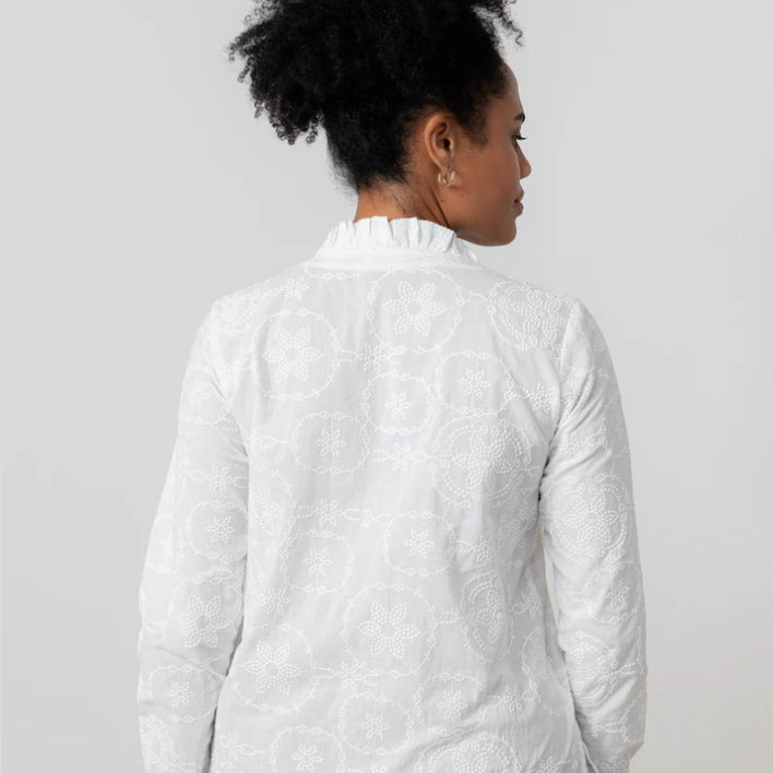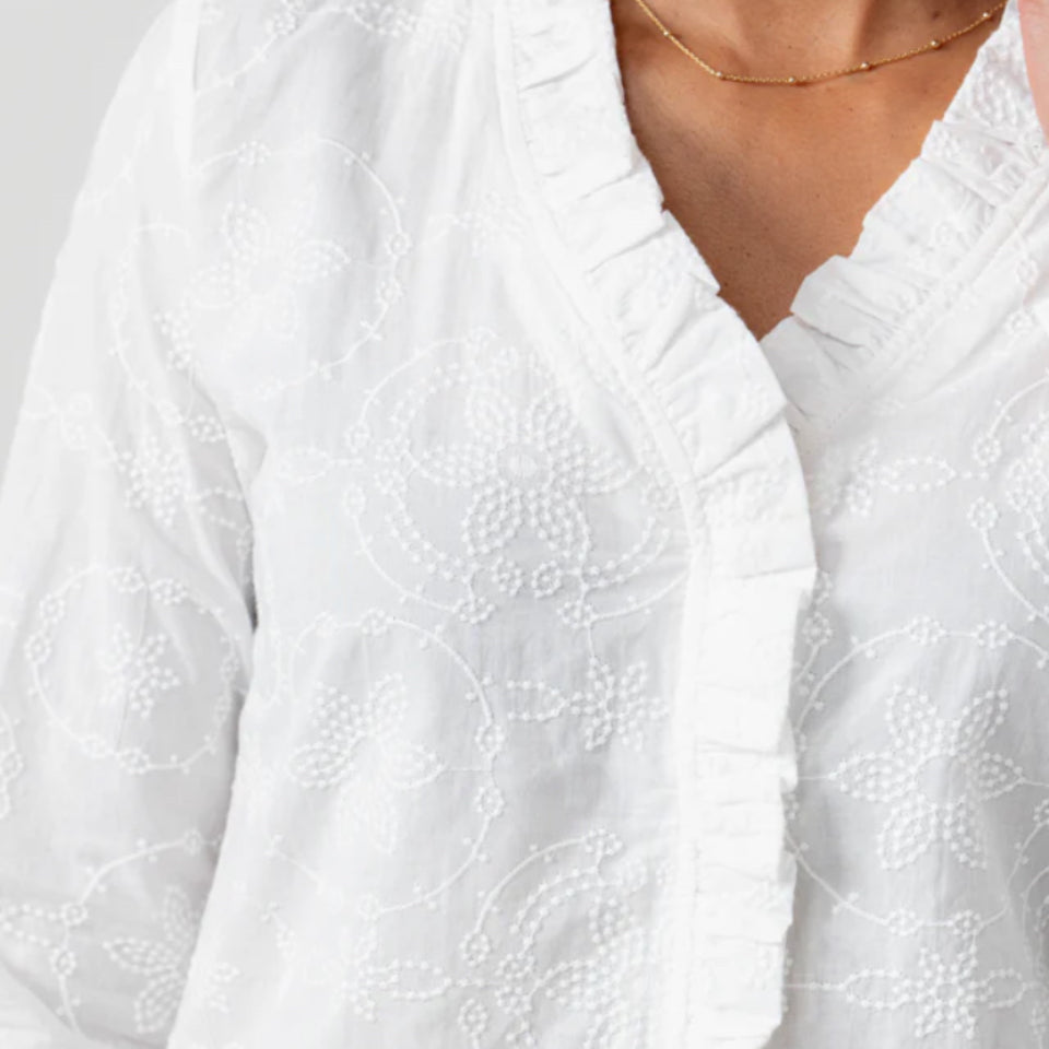 Beautiful embroidered long sleeve white cotton blouse with a frill around the neck and down over the buttons.  The sleeves have ruched cuffs.  All adding up to a feminine confection.