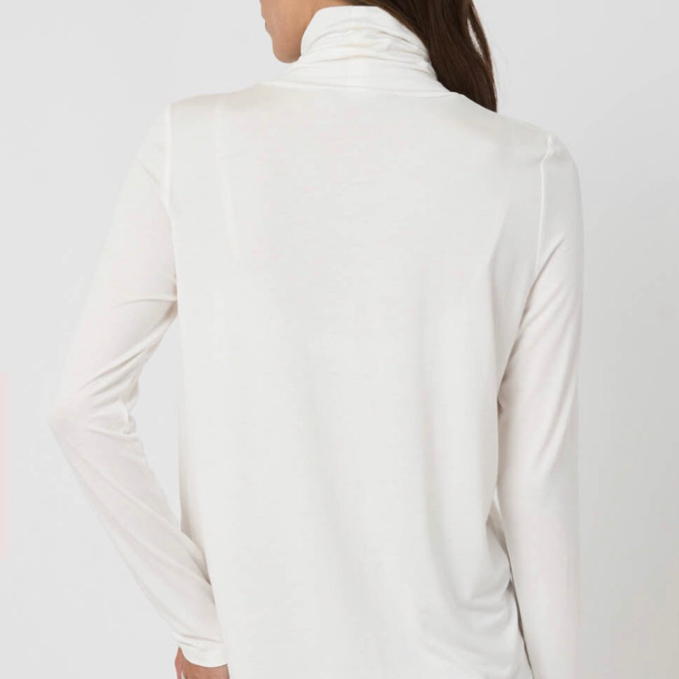 This is a simple, elegant white turtleneck with a soft, relaxed fit, long sleeves, and a lightweight drape that gives it a clean, minimalist look—perfect for layering or wearing on its own.